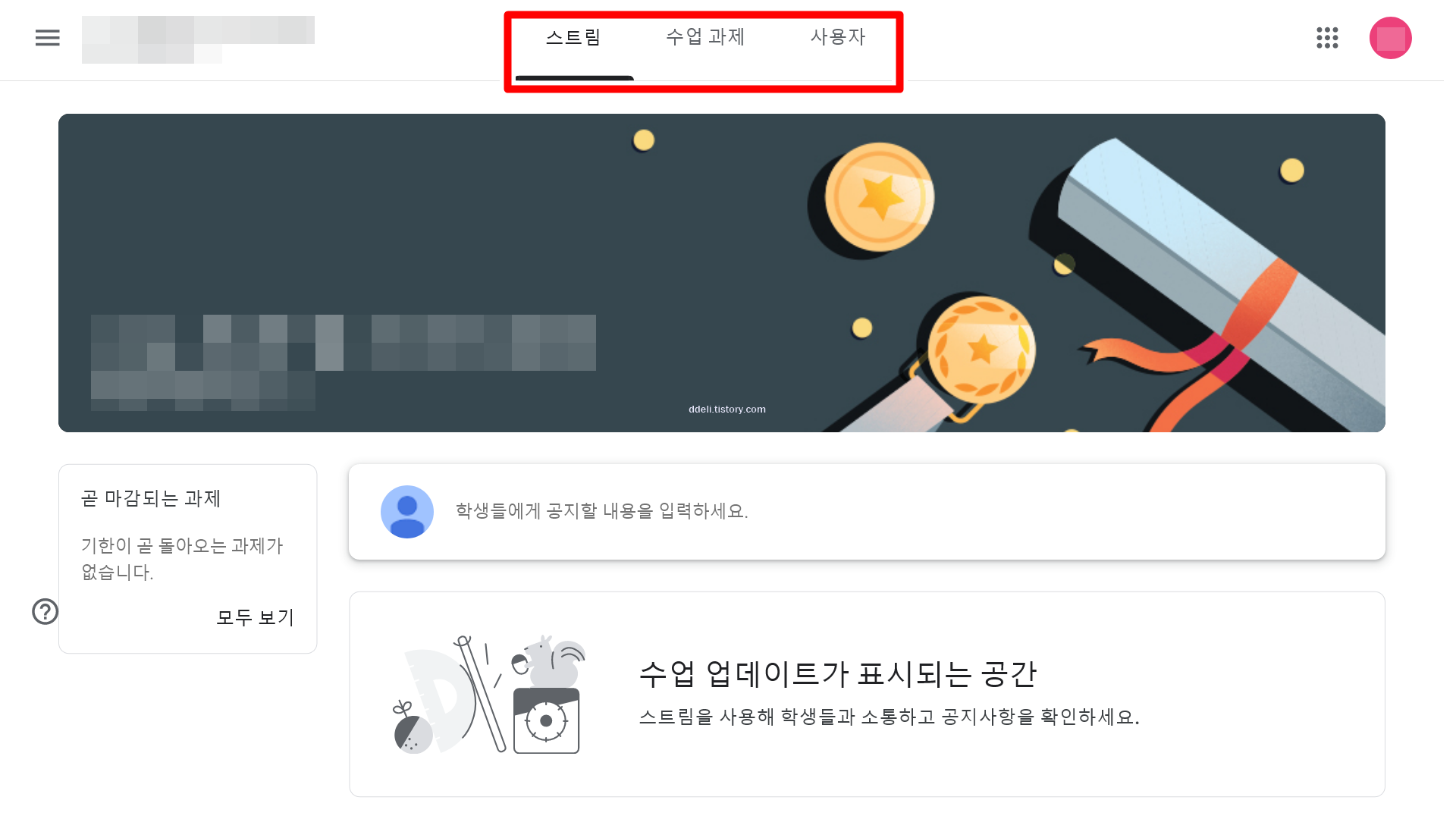 | 09. 클래스룸은 위에 '스트림', '수업과제', '사용자' 3개의 메뉴가 있습니다. 한번 살펴보세요. |
